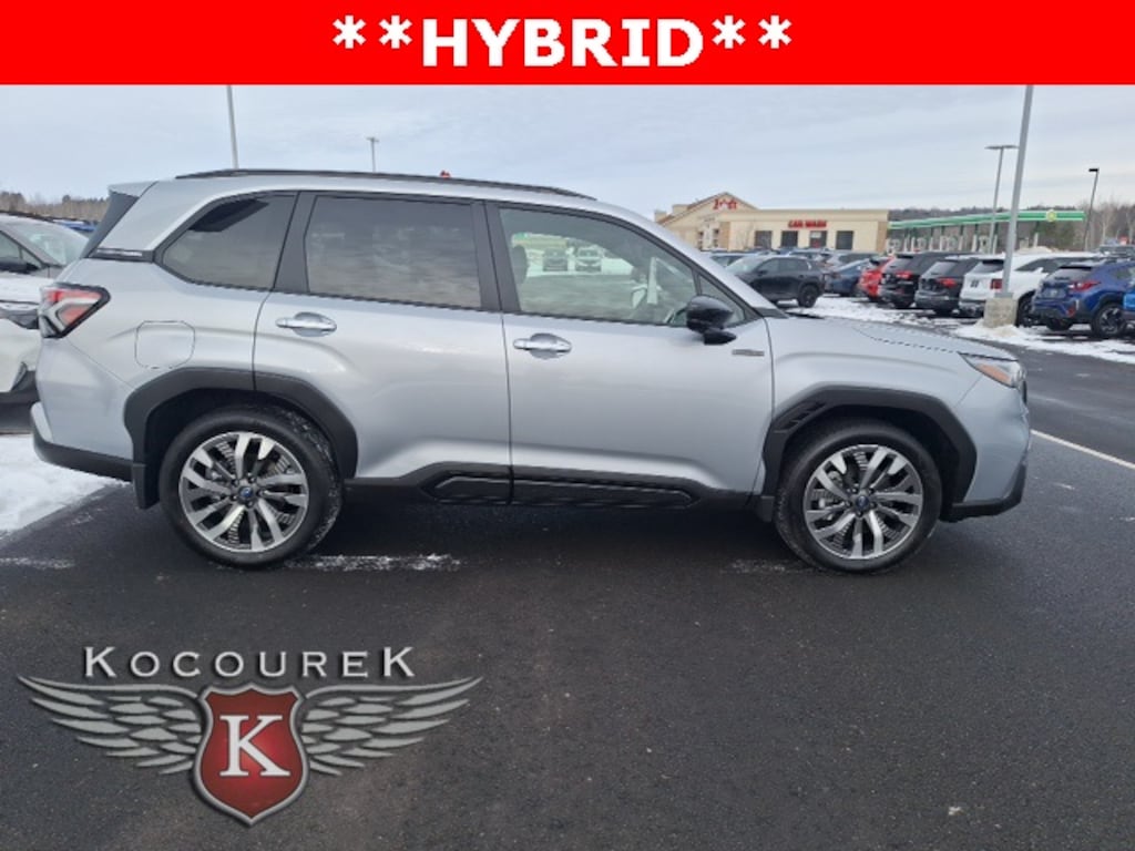 $3,146 off MSRP! Ice Silver Metallic 2025 Subaru Forester Hybrid Touring AWD Lineartronic CVT 2.5L 4-Cylinder DOHC 16V 35/34 City/Highway MPG Bluetooth, Leather Seats, Heated Seats, Power Locks, Visit www.kocoureksubaruofwausau.com, AWD / 4X4 / 4WD, Navigation system: TomTom Navigation w/what3words.