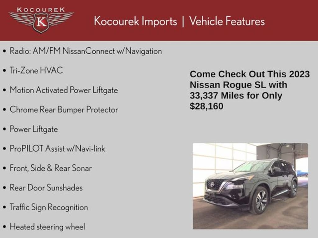 Rogue SL, 4D Sport Utility, 1.5L I3 Turbocharged DOHC 12V LEV3-ULEV50 201hp, CVT with Xtronic, AWD, Super Black, Light Gray Leather, Bose Premium Audio System, Chrome Rear Bumper Protector, Front Bucket Seats, Front, Side & Rear Sonar, Heated Front Bucket Seats, Heated front seats, Heated steering wheel, Illuminated entry, Leather-Appointed Seat Trim, Motion Activated Power Liftgate, Power Liftgate, Power moonroof, Power passenger seat, ProPILOT Assist w/Navi-link, Radio: AM/FM NissanConnect w/Navigation, Rear Door Sunshades, Rear window wiper, SL Premium Package, Split folding rear seat, Traffic Sign Recognition, Tri-Zone HVAC, 19" Aluminum Alloy Wheels, 4-Wheel Disc Brakes, 5.604 Axle Ratio, 6 Speakers, ABS brakes, Air Conditioning, Alloy wheels, AM/FM Radio, AM/FM radio: SiriusXM, Auto High-beam Headlights, Auto-dimming Rear-View mirror, Automatic temperature control, Black Splash Guards (Set of 4), Brake assist, Bumpers: body-color, Delay-off headlights, Driver door bin, Driver vanity mirror, Dual front impact airbags, Dual front side impact airbags, Electronic Stability Control, Emergency communication system: NissanConnect Services, Floor Mats w/2-Piece Cargo Area Protector, Four wheel independent suspension, Front anti-roll bar, Front Center Armrest, Front dual zone A/C, Front reading lights, Fully automatic headlights, Heated door mirrors, Knee airbag, Leather steering wheel, Low tire pressure warning, Memory seat, NissanConnect featuring Apple CarPlay and Android Auto, Occupant sensing airbag, Outside temperature display, Overhead airbag, Overhead console, Panic alarm, Passenger door bin, Passenger vanity mirror, Power door mirrors, Power driver seat, Power steering, Power windows, Radio data system, Rear anti-roll bar, Rear Parking Sensors, Rear reading lights, Rear seat center armrest, Rear side impact airbag, Rear window defroster, Remote keyless entry, Security system, Speed control, Speed-Sensitive Wipers, Spoiler, Steering wheel mounted audio controls, Tachometer, Telescoping steering wheel, Tilt steering wheel, Traction control, Trip computer, Turn signal indicator mirrors, Variably intermittent wipers, Rogue SL, 4D Sport Utility, 1.5L I3 Turbocharged DOHC 12V LEV3-ULEV50 201hp, CVT with Xtronic, AWD, Super Black, Light Gray Leather, Bose Premium Audio System, Chrome Rear Bumper Protector, Front Bucket Seats, Front, Side & Rear Sonar, Heated Front Bucket Seats, Heated front seats, Heated steering wheel, Illuminated entry, Leather-Appointed Seat Trim, Motion Activated Power Liftgate, Power Liftgate, Power moonroof, Power passenger seat, ProPILOT Assist w/Navi-link, Radio: AM/FM NissanConnect w/Navigation, Rear Door Sunshades, Rear window wiper, SL Premium Package, Split folding rear seat, Traffic Sign Recognition, Tri-Zone HVAC.